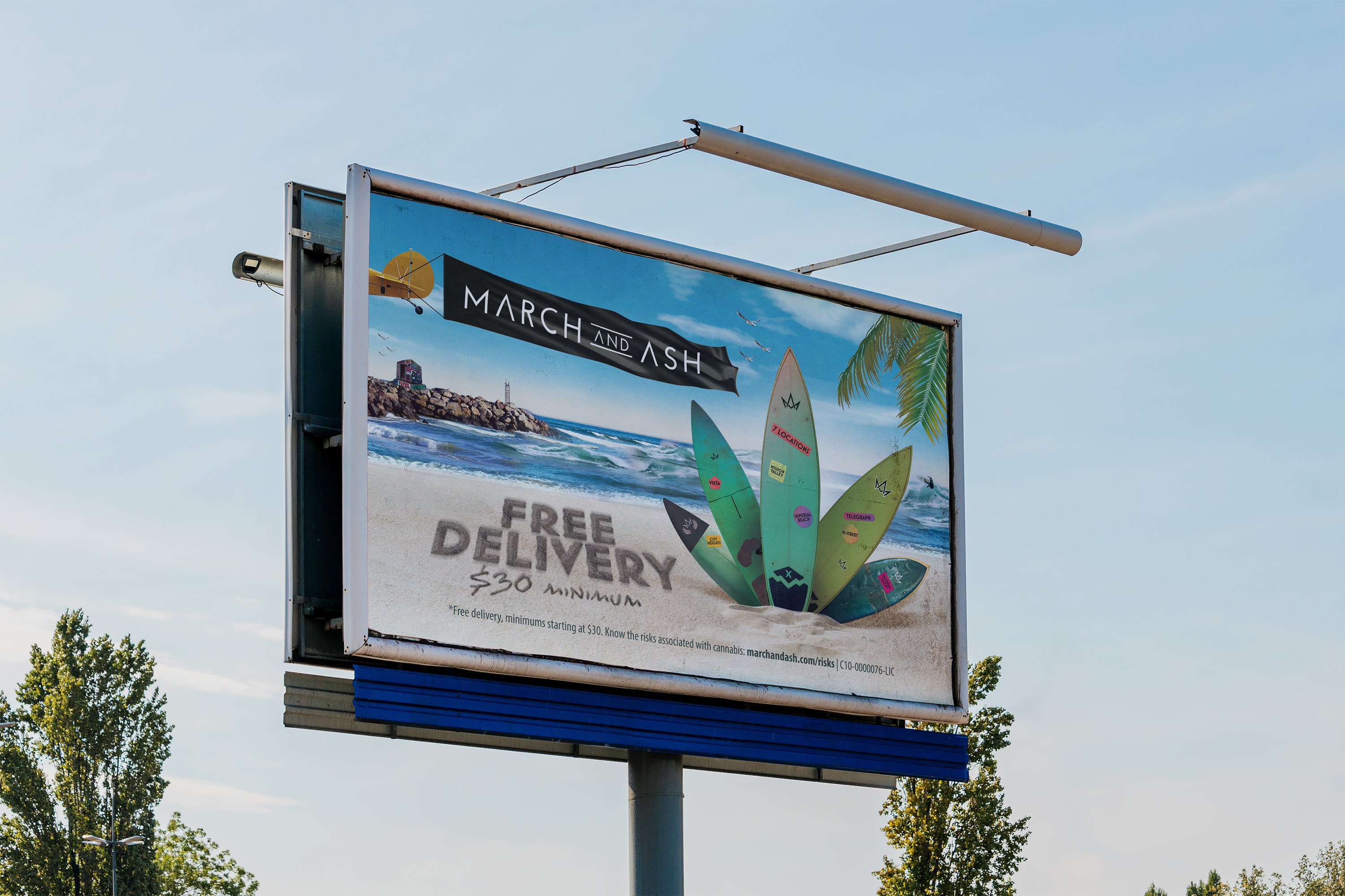 I created a billboard to promote March and Ash’s Free Delivery service in Mission Beach, a popular surfing spot in San Diego. The design used photo editing to showcase San Diego’s beautiful coastline, colorful surfboards, all the March & Ash locations, and well-known Mission Bay landmarks like a graffiti monument and surfers riding the waves.